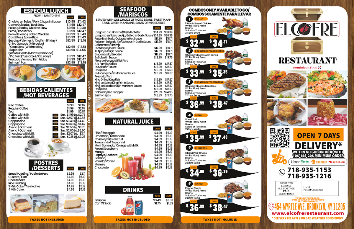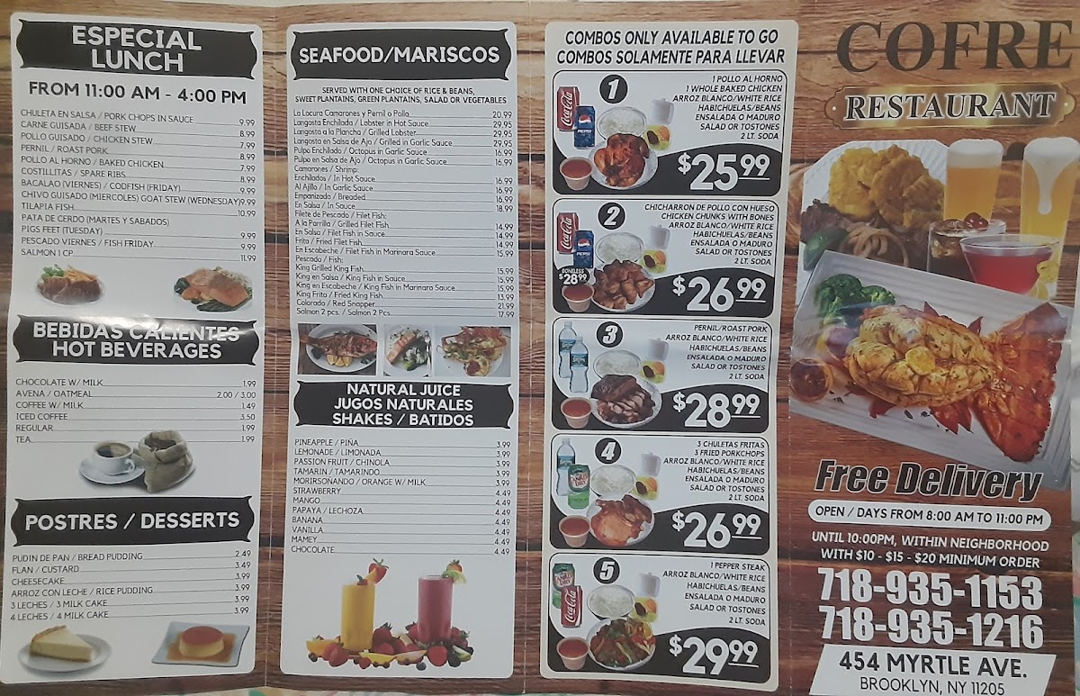 Welcome to El Cofre, a delightful culinary gem located in the heart of Brooklyn. This vibrant eatery serves an enticing menu that beautifully blends traditional flavors with a modern twist. One of the standout offerings is the Desayuno Americano, featuring perfectly cooked eggs paired with succulent pork or beef sausage and golden home fries—ideal for starting your day right.